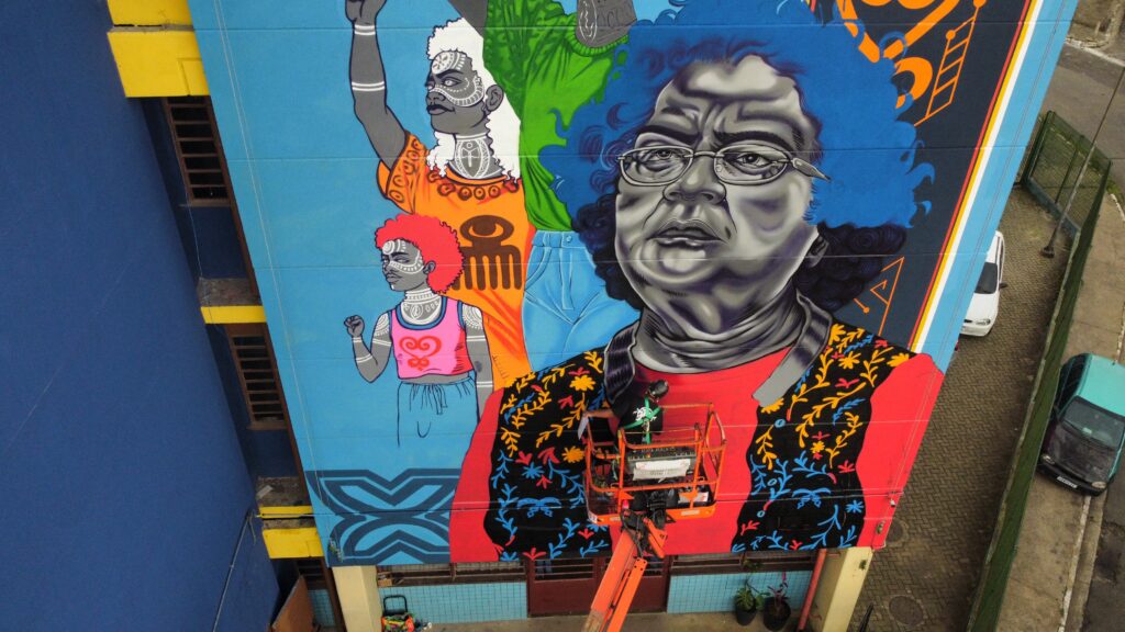 O mural, que integra uma das mais importantes plataformas de arte urbana do país, ressalta a potência de Nilma Bentes como fonte de conhecimento, memória e luta coletiva. A artista Mina Ribeirinha constrói, através da estética amazônida e de sua pesquisa visual sobre mulheres negras, um tributo que dialoga com a trajetória de enfrentamento ao racismo, de defesa dos territórios e de construção de bem viver.